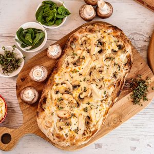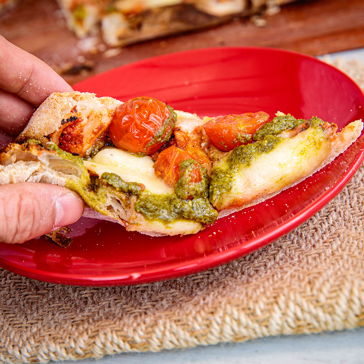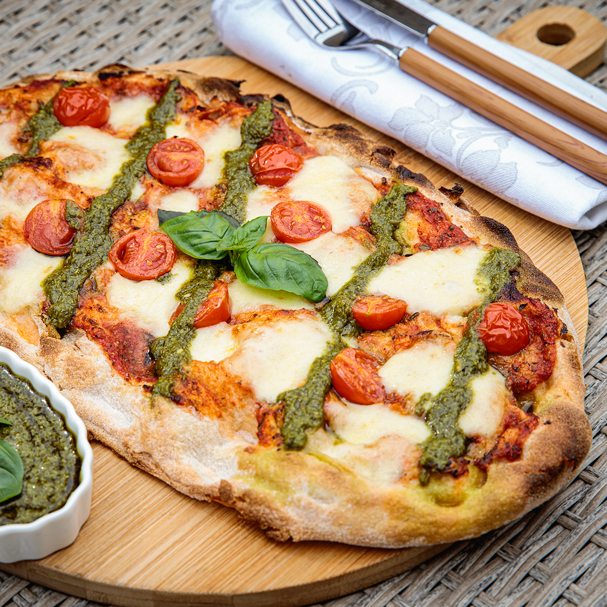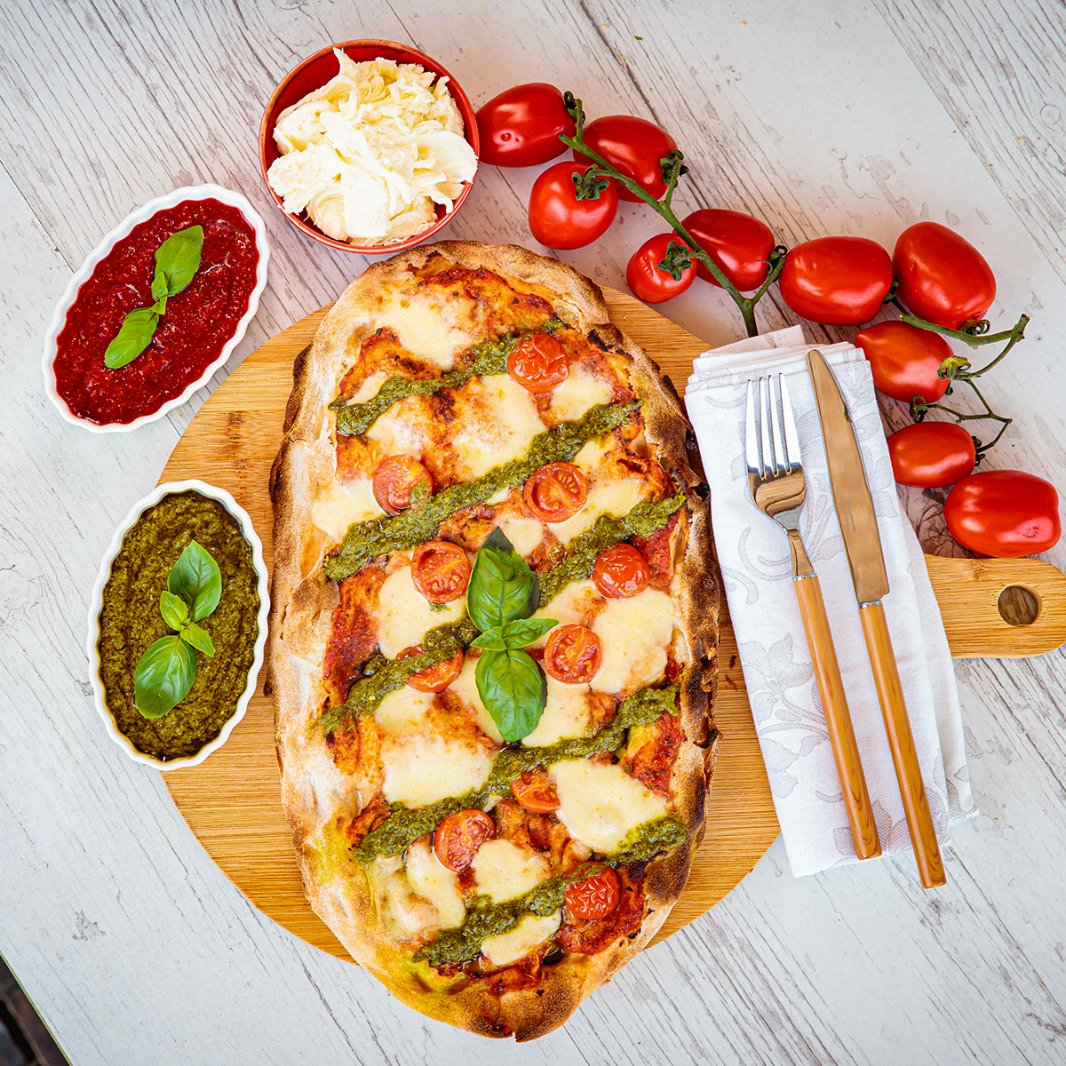 Un gust desavârșit, o combinație perfectă intre mozzarella fresca, dulceața roșiilor cherry și pesto proaspăt, ușor astringent, ce se contopesc intr-un blat perfect rumenit, dospit lent, cu maia naturală.