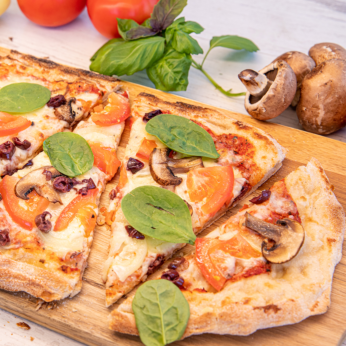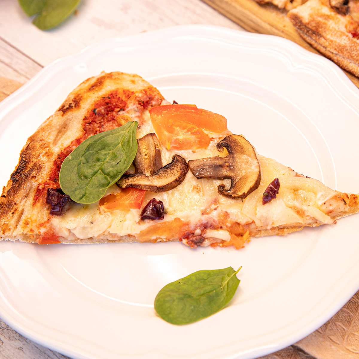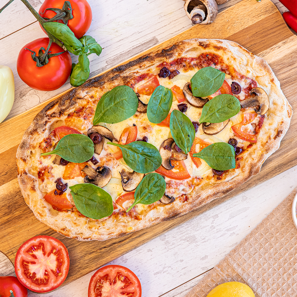 Leggera comme la primavera! O combinație savuroasă și ușoară, o abundență de legume, proaspete, roșii, ardei, măsline, ciuperci și spanac alături de sos de roșii si mozzarella intr-o pizza delicioasă și sănătoasă.
